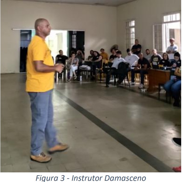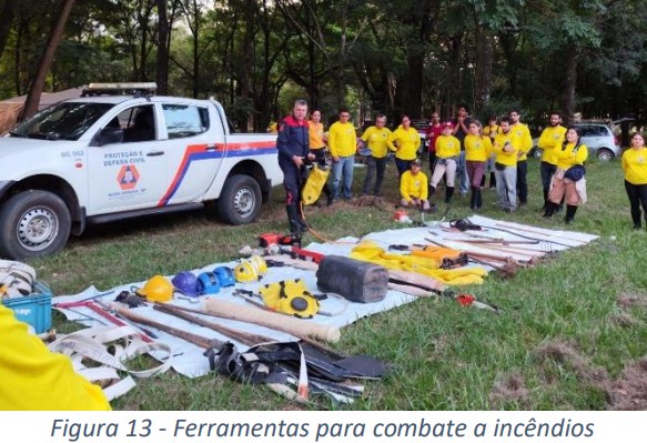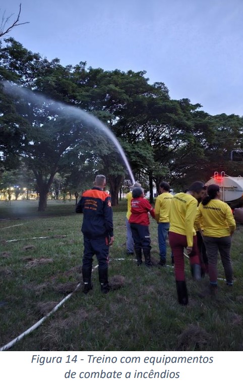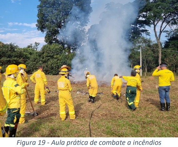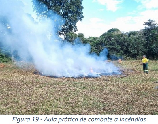 - Aula prática de combate a incêndio florestal: atividade prática realizada em campo de treinamento apropriado. Combate a incêndio com uso de abafadores e mochila costal flexível. Combate a incêndio com uso do abafador. Instrução de manuseio correto dos equipamentos.